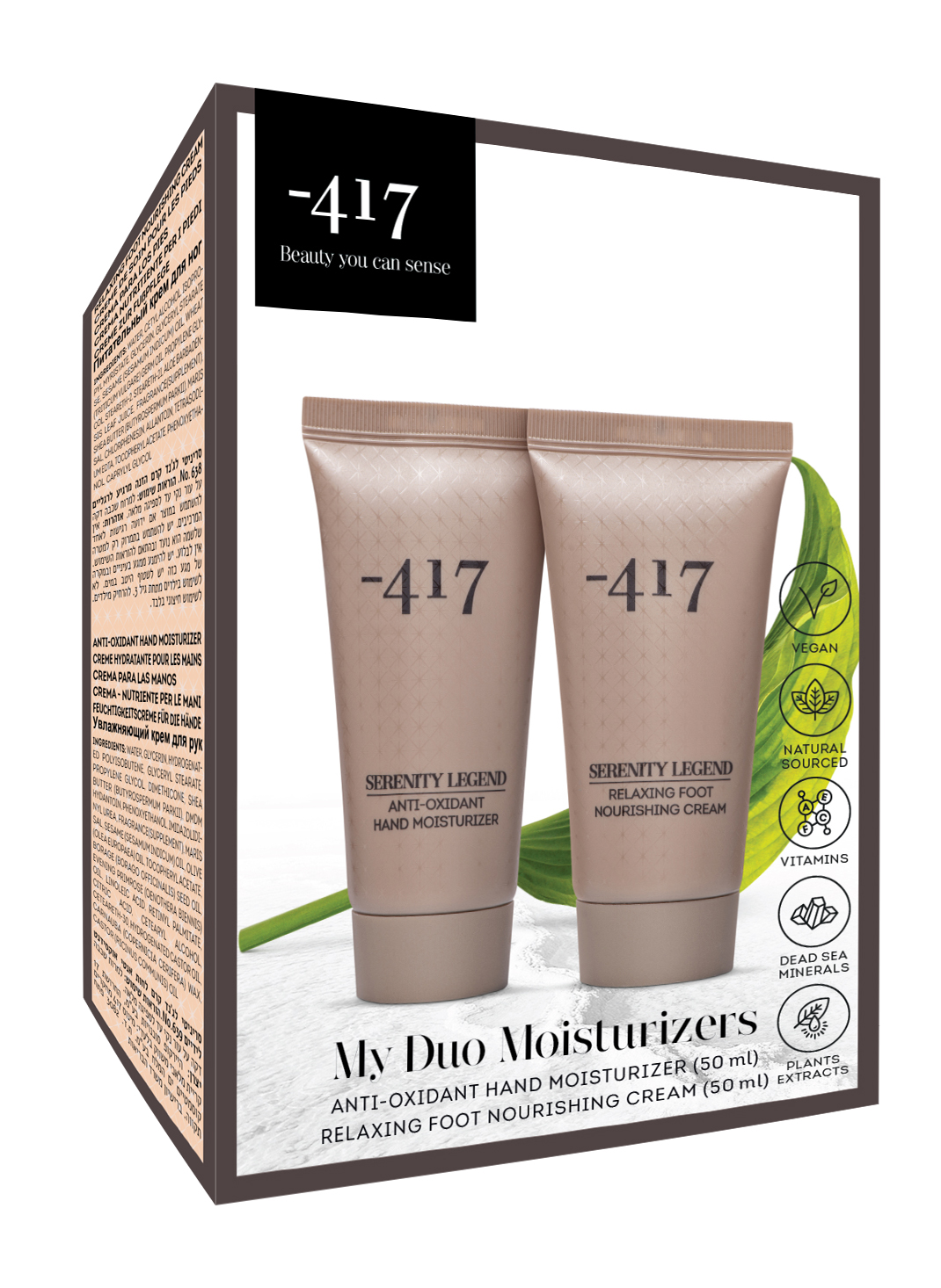 - 417 - это мир удивительных впечатлений и незабываемых ощущений; это красота, которую можно почувствовать! Эффективная программа ухода для красоты и молодости рук и ног! Защитный увлажняющий крем для рук с антиоксидантным действием - это средство специально разработано для защиты рук от вредного воздействия окружающей среды. Мгновенно увлажняет, успокаивает огрубевшую, сухую кожу и восстанавливает ее эластичность. Питательный крем для ног с расслабляющим действием - это экстрапитательное средство для восстановления и смягчения кожи. Усиливает процессы регенерации кожи, устраняет шелушение и предотвращает образование трещин. Обладает расслабляющим, освежающим и защитным действием. Оставляет ощущение свежести и легкости. Веганские формулы с высоким содержанием ингредиентов натурального происхождения. Испытайте уникальный опыт взаимодействия с дарами Мертвого моря!